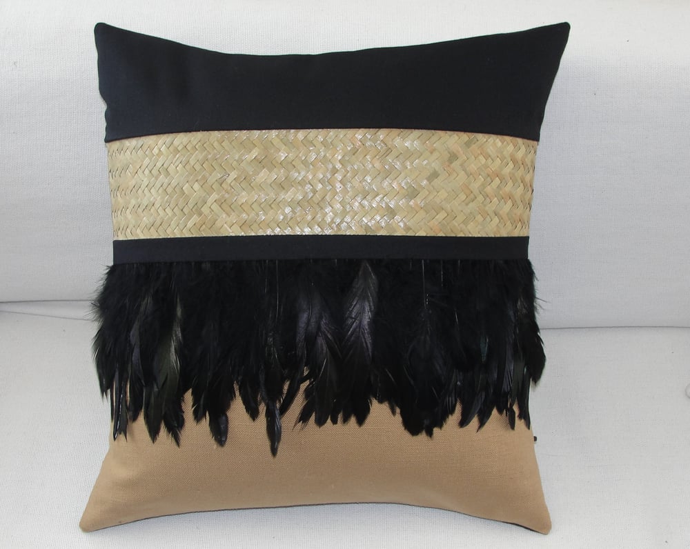 'Rimu' is a lovely square cushion in Black and Tan quality cotton fabric. Black feathers and a panel of natural woven matting.